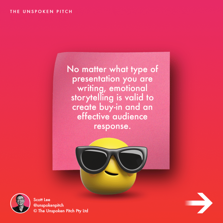 No matter what type of presentation you are writing, emotional storytelling is valid to create buy-in and an effective audience response.