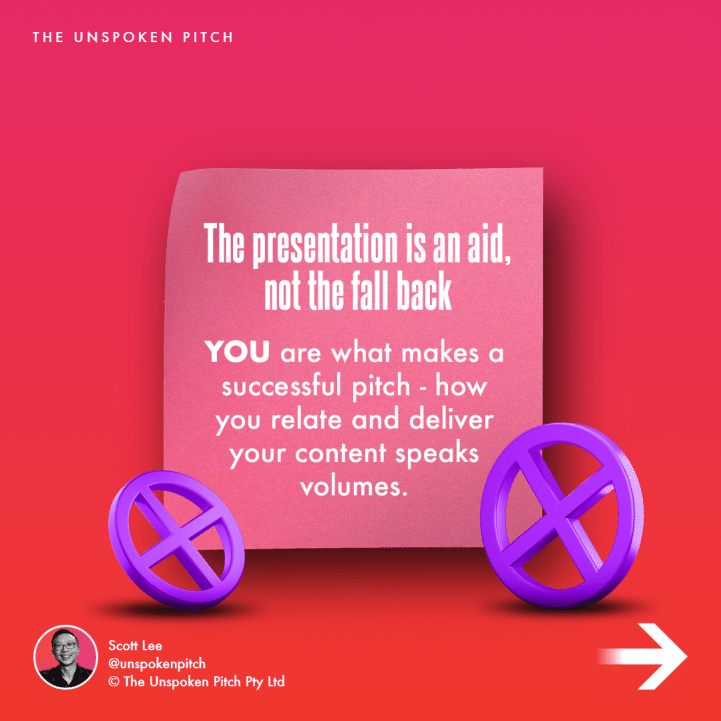 The presentation is an aid, not the fall back – YOU are what makes a successful pitch – how you relate and deliver your content speaks volumes.